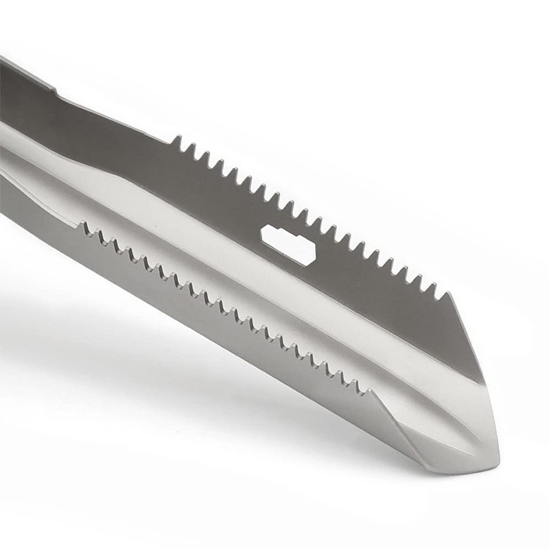 - Multi-tool design includes shovel, saw, ruler, hex wrench, bottle opener, flat screwdriver.