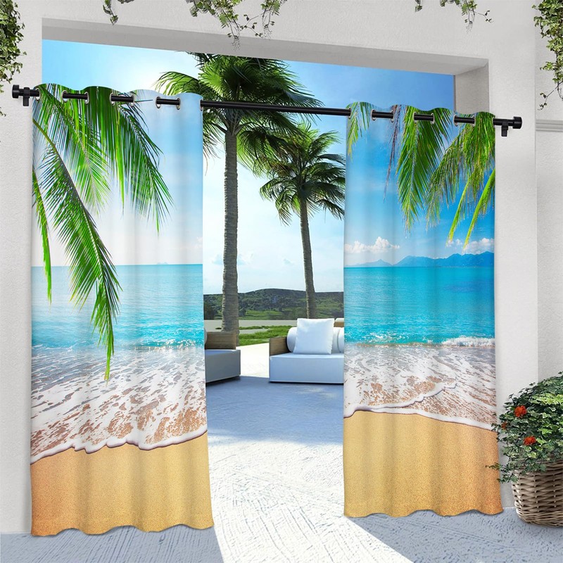 ANHOPE Outdoor Curtains Grommet Top Waterproof Window Drapes Tropical Hawaii Palm Tree Beach Ocean Print Pattern Outside Privacy Curtains for Patio Pergola Gazebo Cabana Porch 2 Panels 60 x 120 Inch