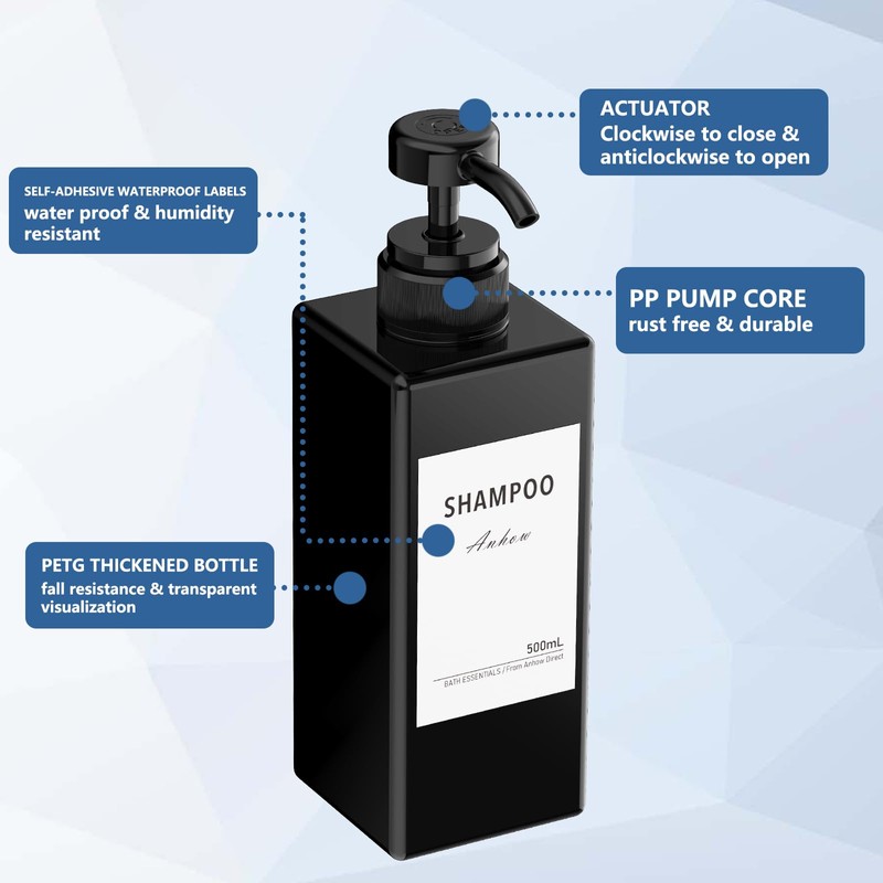 Anhow 3 x 500 ml Shampoo Bottles for Filling, PETG Soap Dispenser Plastic with Category Labels for Empty Refillable Pump Bottles - Black