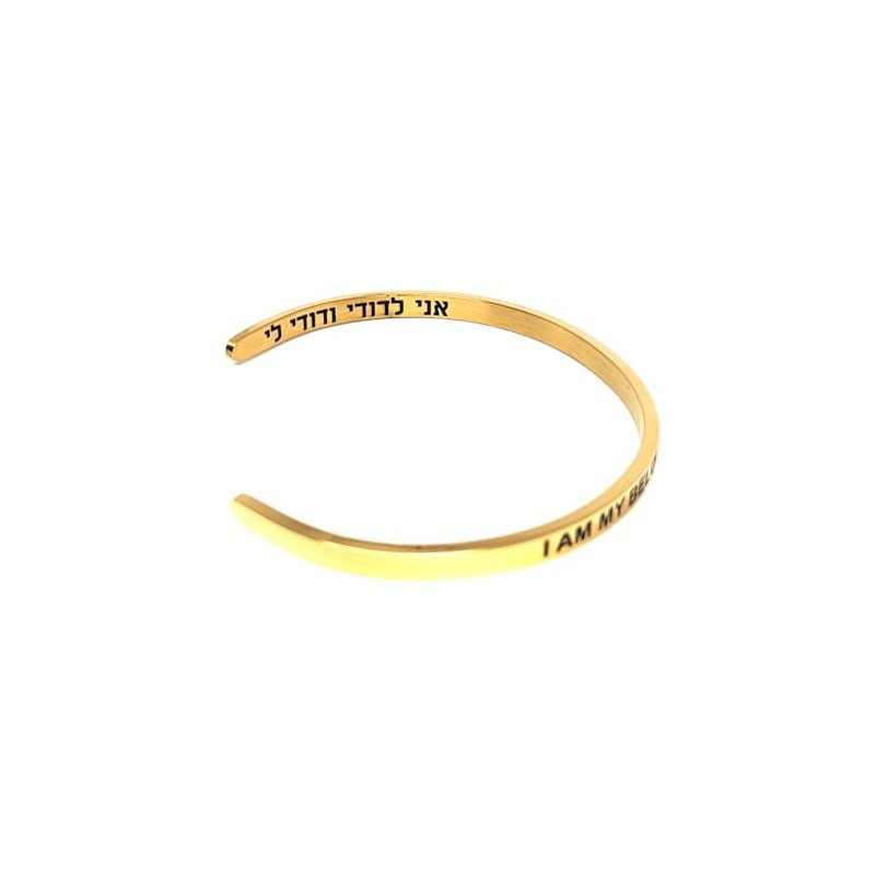 • This bracelet features stackable open cuff design and a phrase from the Song of Songs engraved in English on the outer part of the bracelet: "I AM MY BELOVED'S AND MY BELOVED IS MINE" and in Hebrew on the inner part: "Ani LeDodi VeDodi Li"