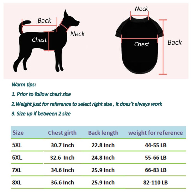 - Size 5XL: Chest girth/30.7 Inch, Back length/22.8 Inch, suit for weight 44-55 LB, If your pet is between two sizes,please choose the larger size