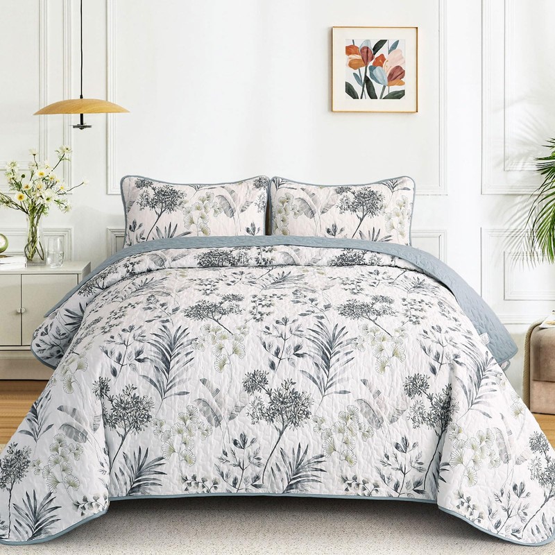 - 【Elegant Blue Grey Floral Quilt】: A cozy quilt set in a modern, traditional and elegant style to help you update your bedroom decor and create a beautiful room décor. Classic blue-gray color with twig design and delicate fabric texture complements this floral bedspread.