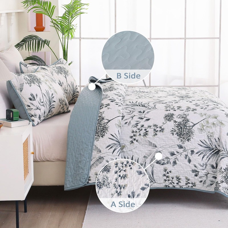 Our quilt set is specially designed with closed box double stitching of quilted bed cover to keep the filling uniform and prevents it from clumping and shifting after using and washing. Elegent and modern floral pattern makes it the best bedding decorctive for your room