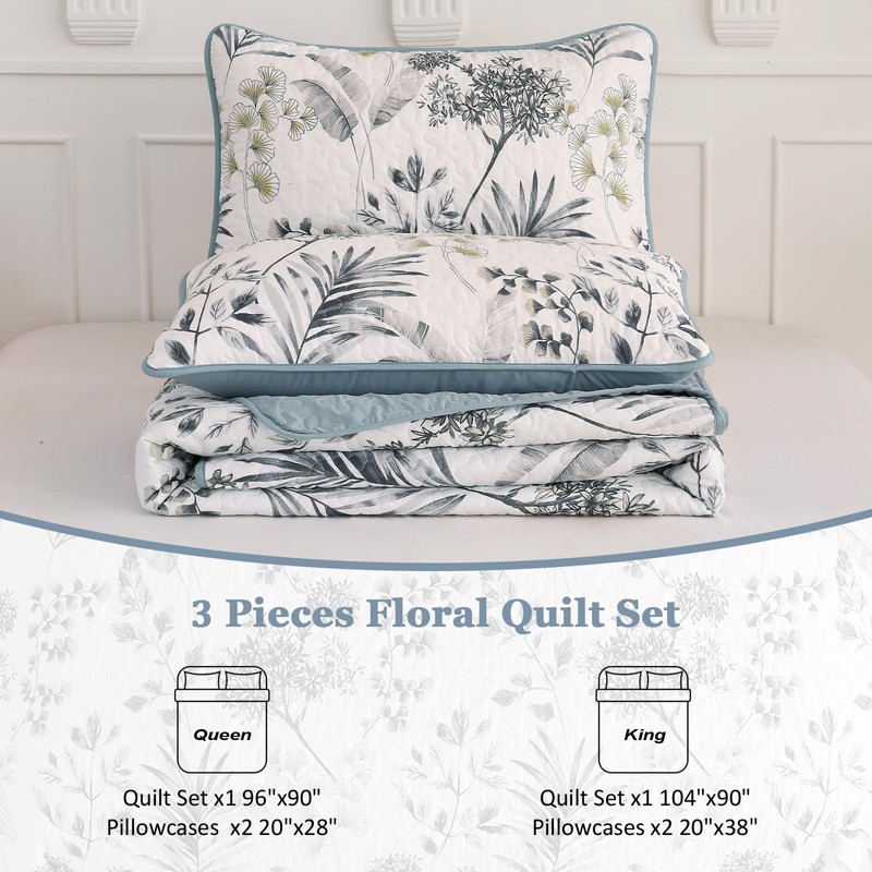 Anibedding King Size Quilt Sets Blue Floral Pattern Bespread Set, 3 Pieces Botanical Quilt Soft Microfiber Bedding Coverlet Set for All Season(104" x 90)