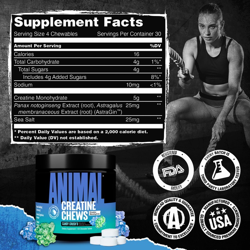 Unleash the Power of Animal Creatine Chews Strength, Recovery, and Convenience Redefined Packed with 5g of highly potent, pure Creatine Monohydrate per serving, these delicious chewable creatine tablets deliver muscle-building benefits without the mess or hassle of traditional creatine powders. They help boost strength and endurance, and support muscle recovery Gummies vs. Chews Unlike creatine gummies, which can lose potency due to water dilution Animal , Creatine Chews provide superior absorption and effectiveness. Enhanced with AstraGin (a blend of Panax Notoginseng and Astragalus Membranaceus) and Sea Salt. This formula maximizes nutrient uptake and hydration, delivering unmatched performance. Extensively Tested for the Highest Quality All Animal supplements are manufactured in a GMP-certified US facility, with each batch third-party lab tested for quality, safety, and potency. Confidently enjoy the raw benefits and gains of creatine without compromise. Flavor Meets Performance Forget bland, chalky creatine supplements. These chews come in a delicious lemon flavor. Whether you're hitting the gym or recovering at home, the flavored creatine tablets are your go-to for building strength and speeding up muscle recovery. Designed for All Fitness Fanatics A trusted source of creatine for women and creatine for men who seek a better alternative. Ideal for both male and female fans of creatine gummies for men and creatine gummies for women. Packaged in a convenient, travel-friendly tub, these chews are ideal for gym bags and on-the-go lifestyles. Take as pre workout gummies for men or post workout recovery supplements for women. Grab, chew, and conquer your workouts anywhere. Experience the Difference with Animal Trusted by athletes for over 40 years, powered by science, and designed to fuel your fitness journey. *Statements regarding dietary supplements have not been evaluated by the FDA and are not intended to diagnose, treat, cure, or prevent any disease or health condition