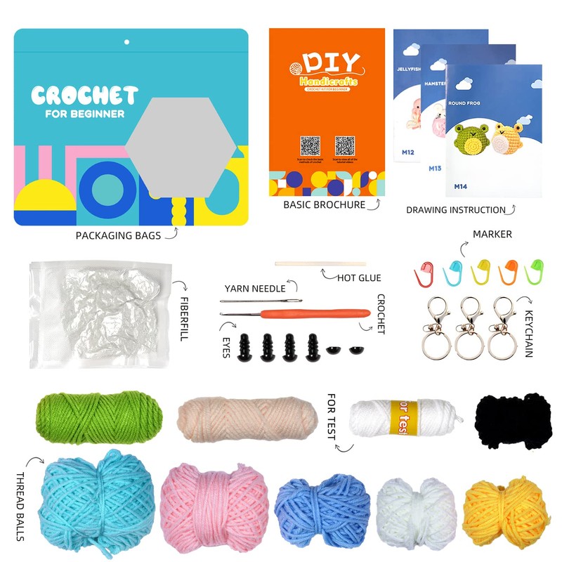 - Crochet set for beginners: this crochet kit contains 1 x packaging bag, 9 x cotton wool, 1 x fibre filling, 1 x crochet hook, 1 x yarn needle, 5 x maker, 6 x eyelets, 2 x instructions, 3 x key rings. All these tools help beginners learn to crochet better.