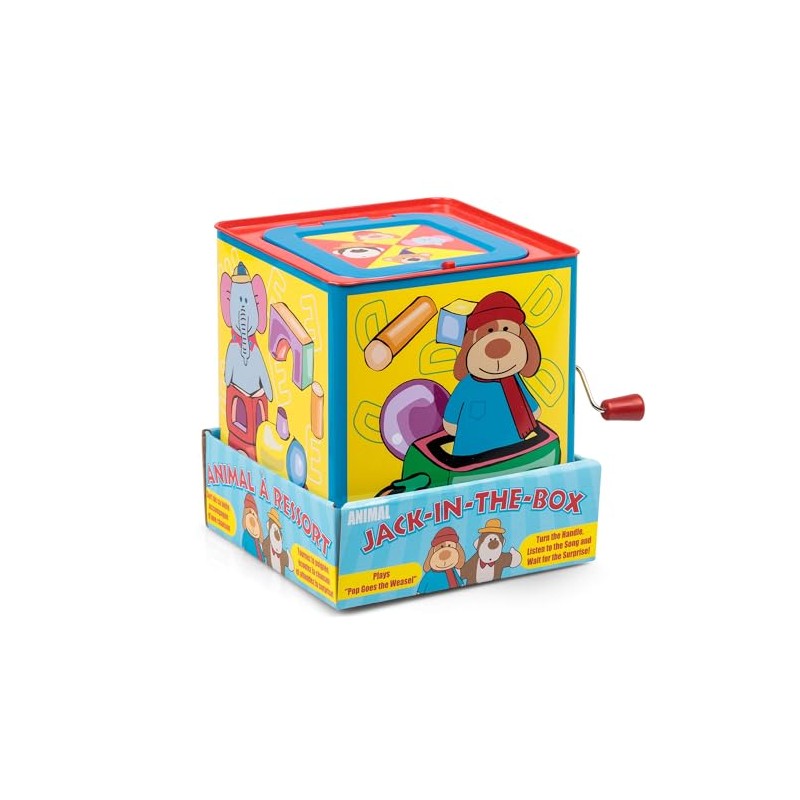 - Turn the handle and the box plays Pop Goes the Weasel - at the end of the song a colourful fabric animal bursts out the top of the box