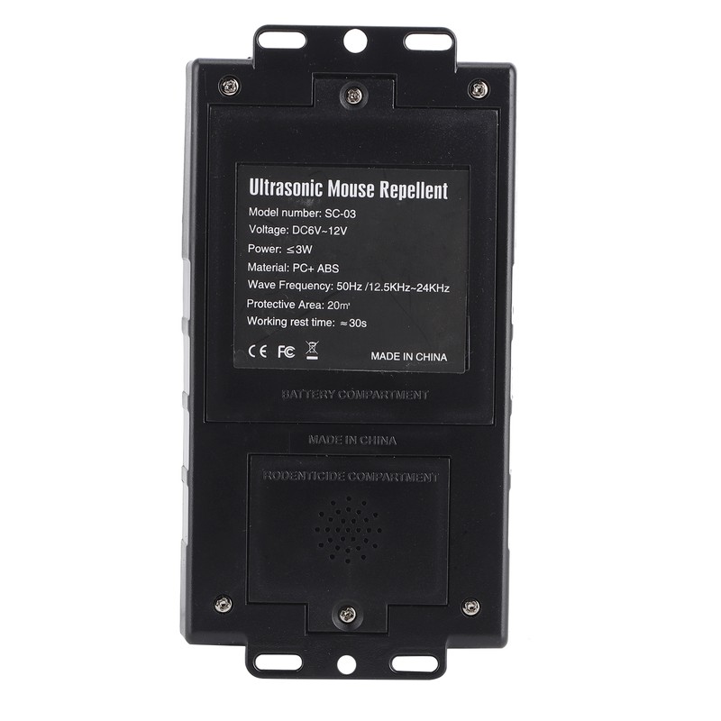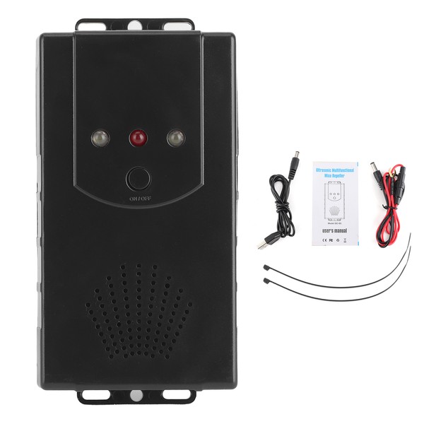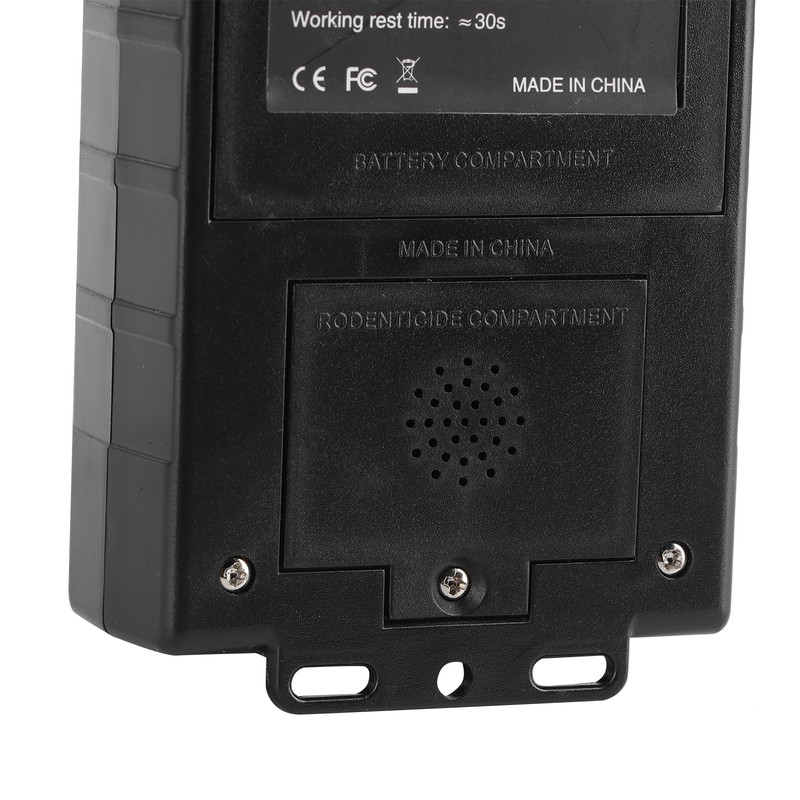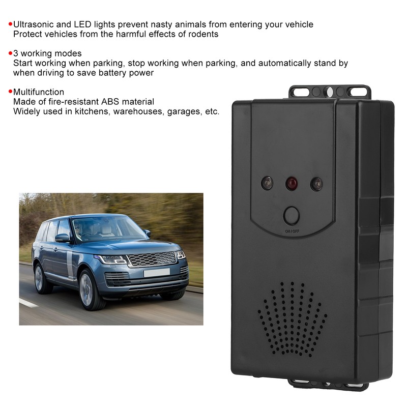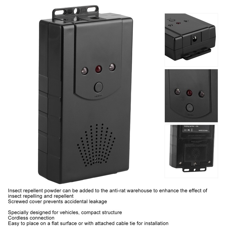 1、Specially designed for vehicles, compact structure, cordless connection, easy to place on a flat surface or with attached cable ties for installation, almost can be used in garages, attic and other places. 2、Vibration switch, automatically turn off when vibrated or when the car is moving, and work automatically after being stationary, saving power. Anti‑rat warehouse can add insect repellent powder to enhance the effect of repelling insects and rats, and the screw‑fixed cover can avoid accidental leakage. 3、Ultrasonic waves and LED lights prevent nasty animals from entering your vehicle and protect the vehicle from the harmful effects of rodents 4、3 working modes, including start working when parking, stop working when parking, automatic standby when driving to save battery power. 5、Multipurpose, made of fire‑resistant ABS material, also widely used in kitchens, warehouses, garages, etc.