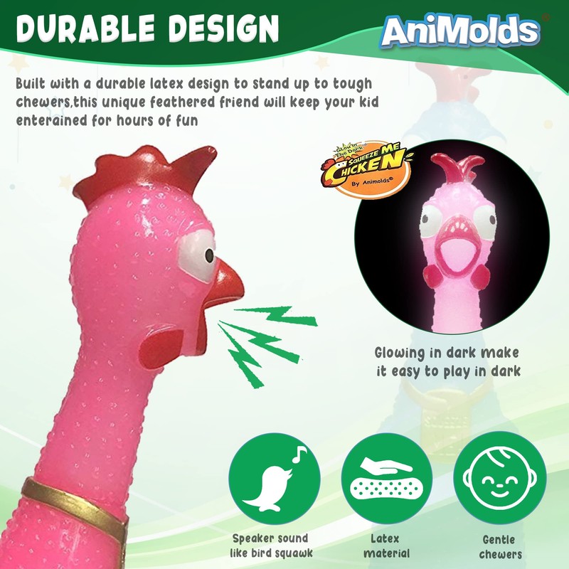 Animolds Squeeze Me Glow in The Dark Rubber Chicken Toy | Screaming Rubber Chickens for Kids | Novelty Squeaky Toy Chicken 2-Pack (Random Colors)