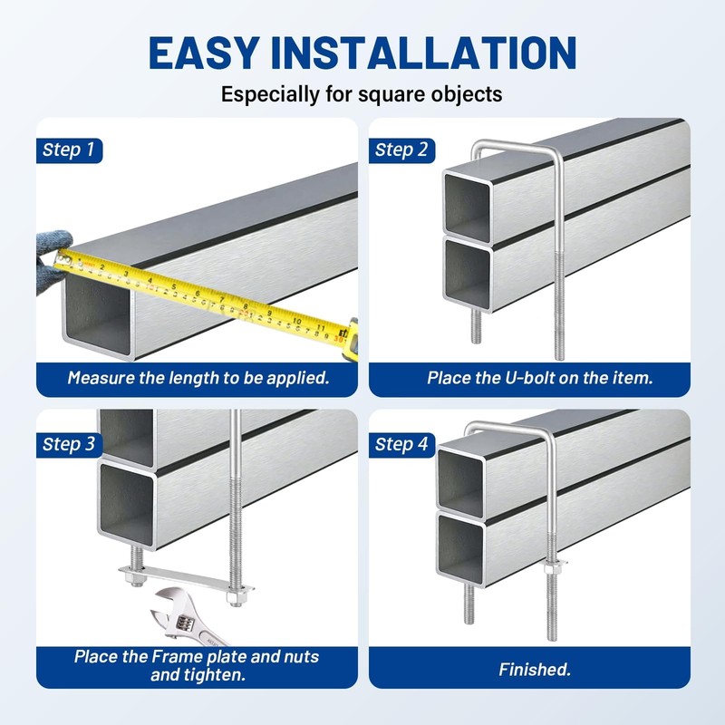 - Complete Set: Includes 4 U bolts, 4 frame plates and 8 nuts to meet your use needs, the attached nuts and frame plates are a good complement to make the installation process simple and clear; Use lubricants to prevent wear when installing