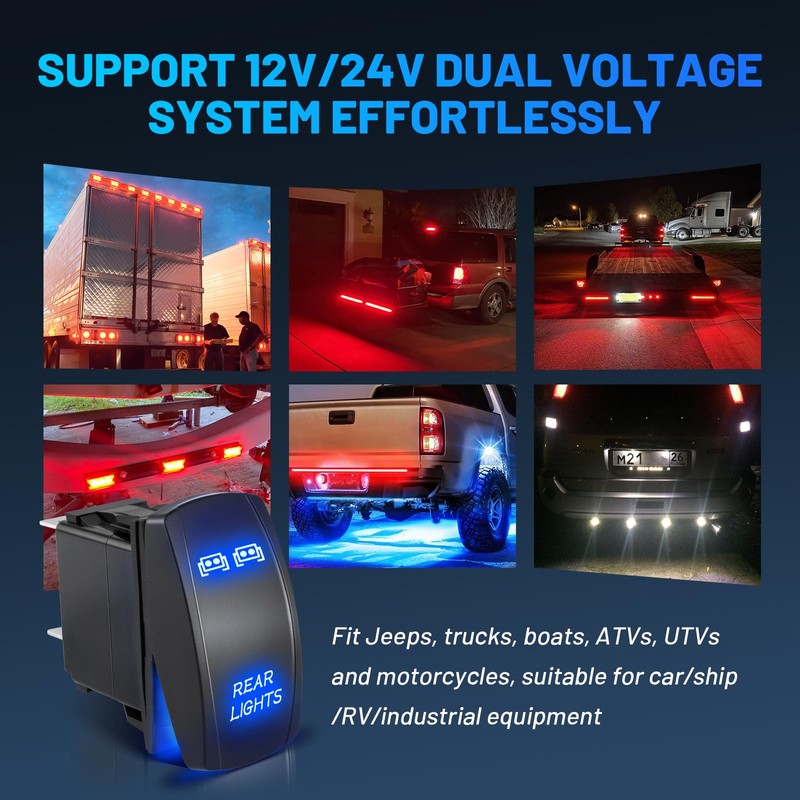 - Rear Light Marks: The 5 termina LED rocker switch is designed as SPST (single pole single throw), rated at DC 12V/20Amp and DC 24V/10Amp; Laser-etched patterns and text designed for Back up Lamps provide unique on-off control and fade resistance for modified or newly added lights