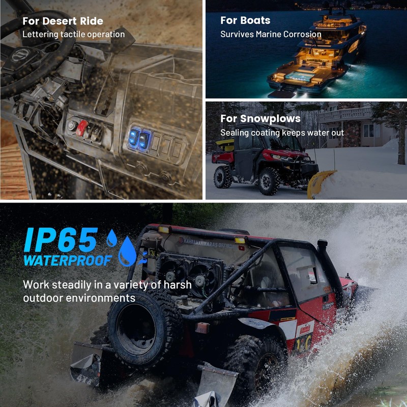 - IP65 Waterproof Rating: With marine-grade construction, this light bar marine LED switch can be used in both automotive and marine areas and widely used at most car, ATV, UTV, SUV, RV, off road vehicle, truck, boat, yacht, Polaris Ranger RZR, Kawasaki, Can-Am and more