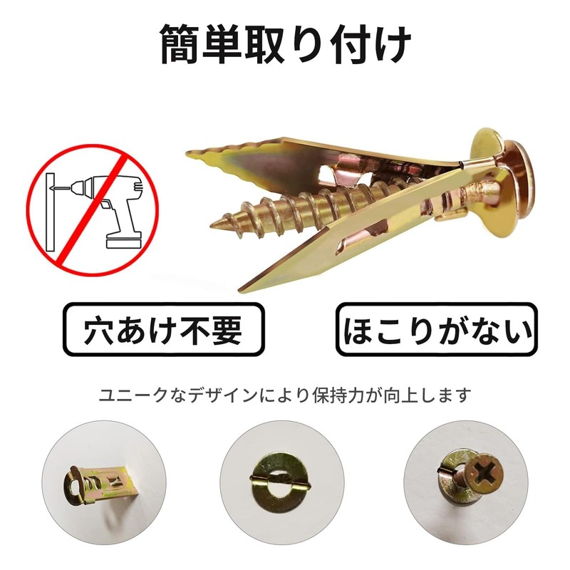 - Simple Installation: 1. Put the wall anchor into the drywall. 2. Insert the self-drilling screw into the anchor hole. ③ Tighten the screws tightly. The extension is complete, the screw is straight-in design, and the holes will not remain in the wall after use