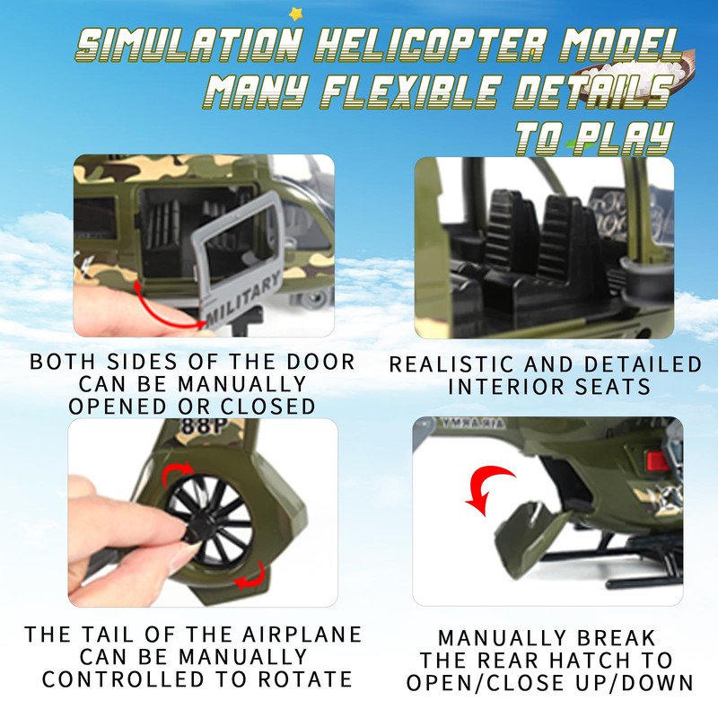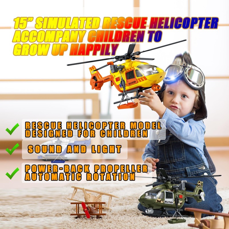 - Easy Play: Our helicopter toy is double doors openable design,pull-back propeller design,collapsible propeller,telescopic hook ,Increase your child's enjoyment of playing.Measures 15 x 4.3 x 5 inches.Need 2*AAA batteries(No include).