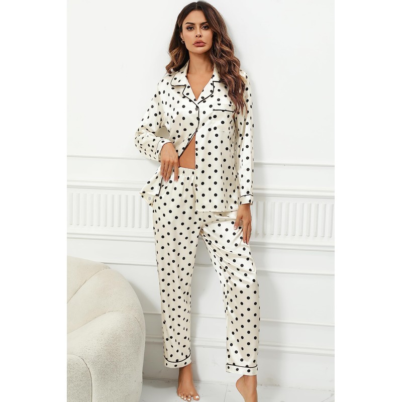 Anjue Silk Satin Pajamas Women Long Sleeve Silk Pjs Set For Women Two Piece Button Down Sleepwear(Black Dot,XL)