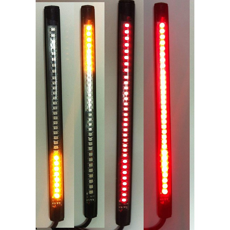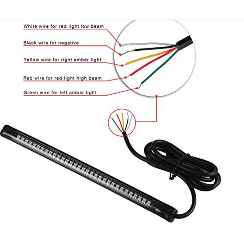 **32 LED Run Brake Turn Strip** Clean up the tail section of you bike by removing huge turn signals or badly designed ORNrear brake lights (Harley CG125 GN125) Perfect for all Motorcycles and scooters This Strip Features: \- 120 degree viewing angle 3 Chip 3528 LEDs for wider visibility + Safety \- Industrial strength 3M Self Adhesive Backing \- Self Adhesive Backing \- Simply Clean Surface & Stick On \- Amber Right + Left Turn Signals \- Running Light illuminates Red at 1/2 brightness then Full 100% brightness as Brake \- 16 gauge Teflon coated wire leads that are 2 feet long \- Input voltage of 12 Volts ~ fits Most All Motorcycles) Wiring & Installation: \- Light bar is a 5-wire hook-up: Running Light, Brake Light, Right Turn, Left Turn, & Ground \- Strip is Flexible- will conform to many surfaces ~ Limitless Mounting Options \- Package Include:1 * Motorcycle LED Brake Turn Signal Light