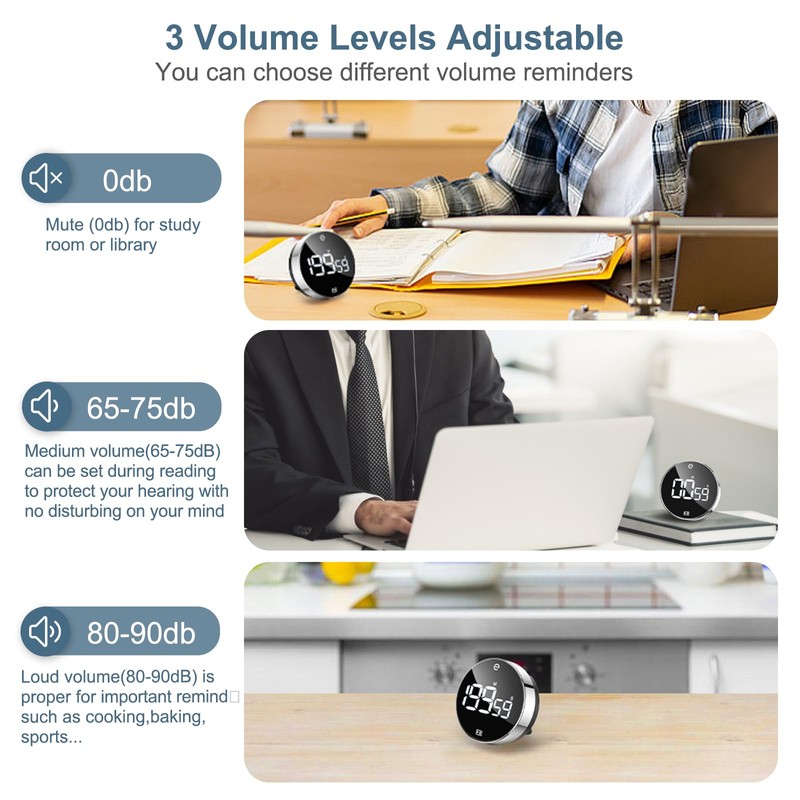 - 3 Levels Volume Adjustment: You can choose different volume alerts to suit different environments; Maximum (80-90 dB) volume is suitable for important reminders, even if you are in another room, you will not miss the loud alarm; Medium volume (65-75 dB) is suitable for fitness and yoga; Silent Mode (0 dB) is suitable for study rooms or libraries, flashing to remind you when the time is up and won't disturb other people