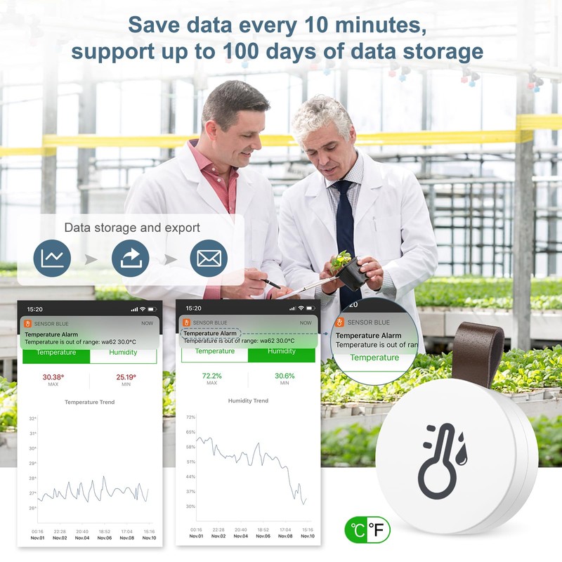 - 【EXPORTABLE DATA】Record a series of data every 10 minutes, can store up to 100 days of data. Support temperature data export function, free download data in CSV format after account login.