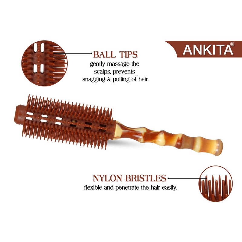 - ANKITA have a wide range of Hair Brushes designed with different types of finishes. They come with different handles such as rubberized, rubber grip or wooden handle. The brushes have thin or thick bristles made of nylon or wooden nodules. This brush is ideal for detangling, smoothening and adding volume and shine to your hair. It comes with ball tipped bristles that easily penetrate the hair, stimulate and massage the scalp and reduce snags and tangles. Suitable for all types of hairs.