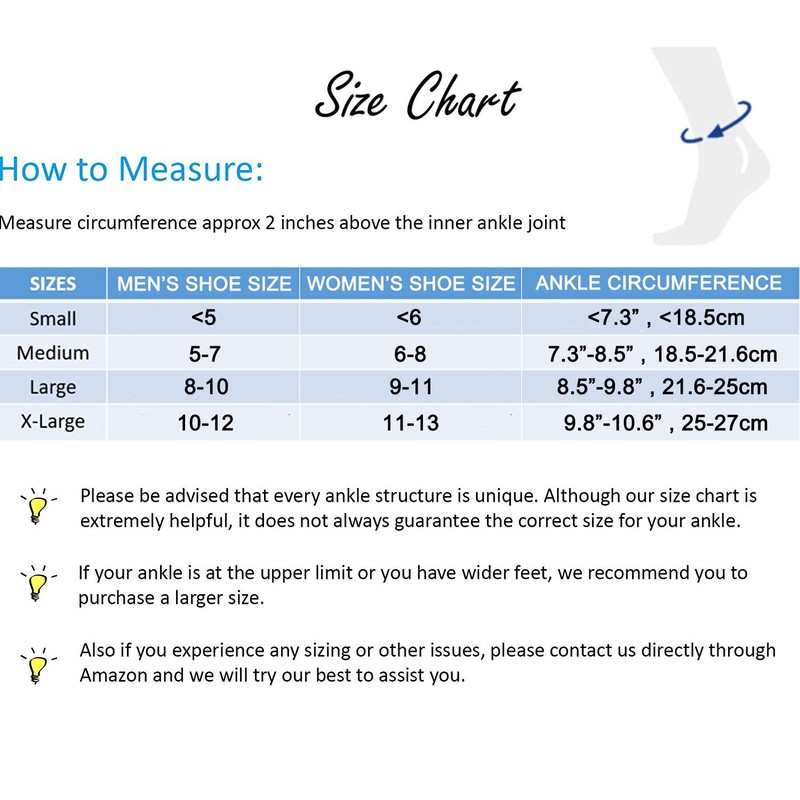 • 4 SIZE AVAILABLE: Suitable for both men and women. Our ankle wrap come in 4 different sizes, please use our size chart to choose the best fit, shoe size is for reference only. The elastic ankle brace can be worn with or without socks and can be easily worn with most styles of shoes.
