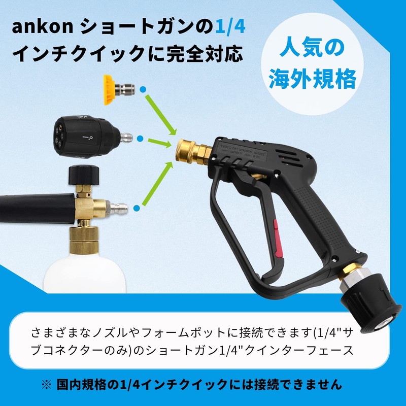 - (Easy to Use High Pressure Wash Short Gun) The ankon High Pressure Wash Short Gun is shorter and lighter than the original long gun and has a short design that is easy to operate with one hand. The end of the short gun adopts a 1/4" quick female interface that can be connected to any 1/4" quick sub-connector (international standard only). The tail of the short gun adopts M22-14mm female thread interface, which can be directly connected to the hose of M22-14mm female thread joints. (Compatible with pressure washers with M22-14mm hoses such as Generac, Simpson, Briggs Stratton, Craftsman, Karcher, Ryobi pressure washers. )