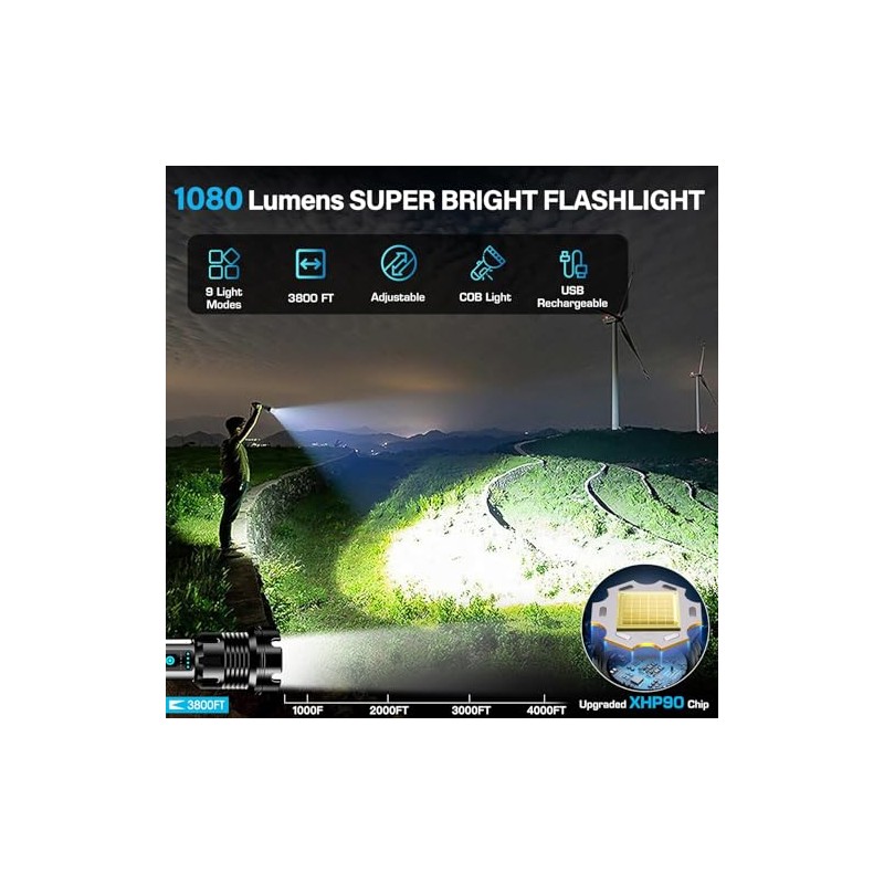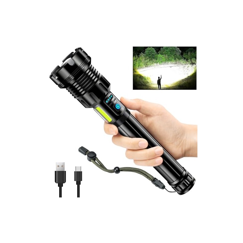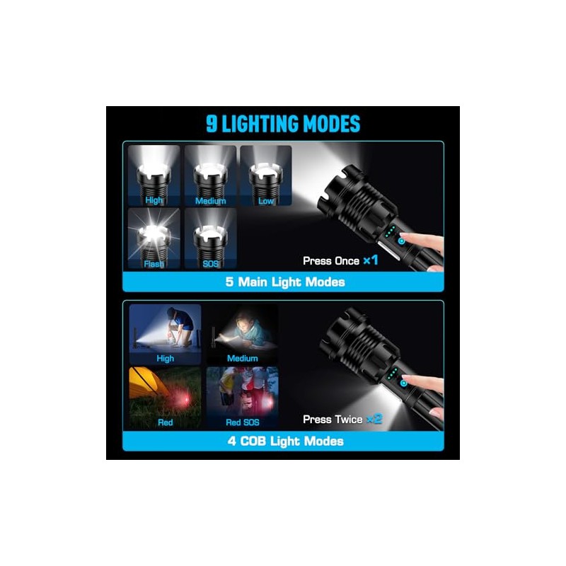 ANKRA Linternas de alto lúmenes de 9000 lúmenes, recargables con luz de trabajo COB, linterna LED súper brillante, con zoom y 14 modos y linterna táctica impermeable para emergencias, campamento
