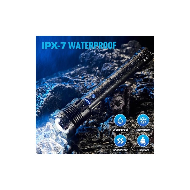 • Realizado con aluminio de grado aeronáutico, esta linterna tiene una calificación de impermeabilidad IPX6, por lo que es confiable incluso en condiciones climáticas extremas. Su diseño a prueba de golpes y resistente a las caídas lo hace perfecto para la exploración al aire libre, pesca, caza y cualquier entorno difícil, asegurando que resiste los elementos.
