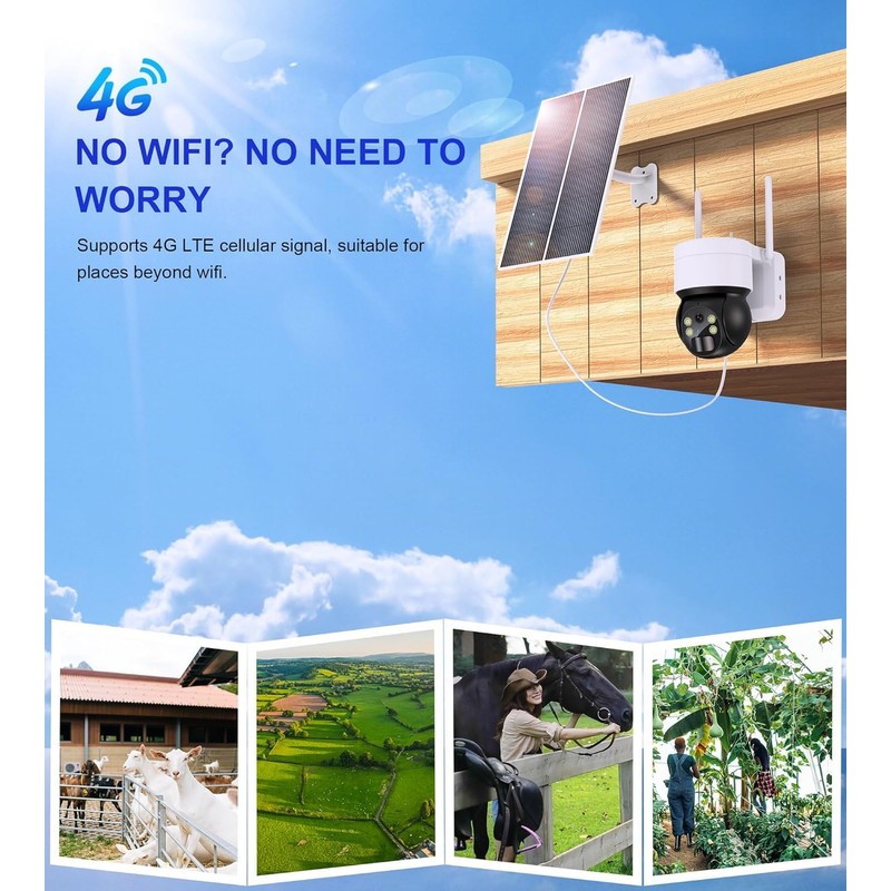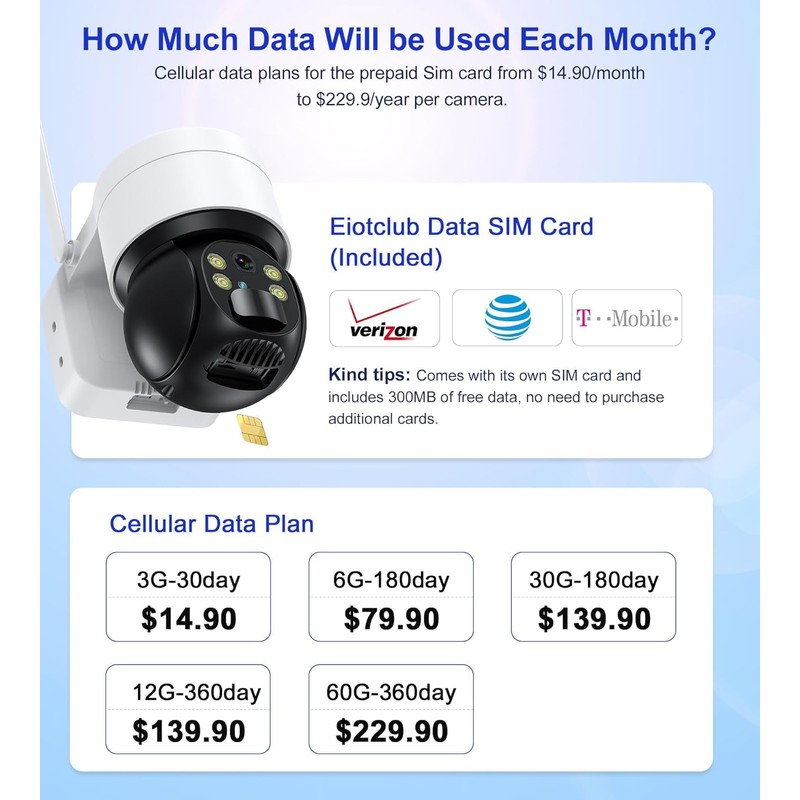 - 【4G LTE Cellular, No WiFi Needed】Stay connected at all times with the 4G LTE cellular feature, no longer will you be constrained by the limitations of WiFi availability. Its versatility makes it an excellent choice for farm security cameras without WiFi requirements. It comes with a SIM card that includes 300MB of free data. Explore additional cellular data plans ranging from $14.90 per month to $229.90 per year per camera. Please note that the SIM card is compatible with the United States only.