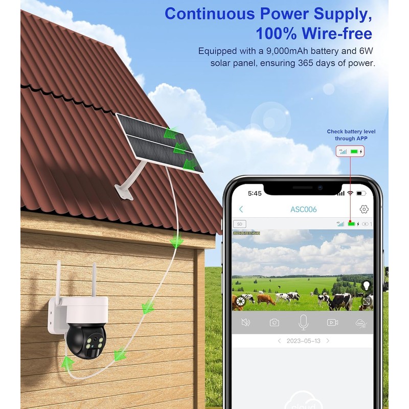 - 【Ultra-Low Power Consumption & 100% Wire-free】This 4G outdoor solar camera focuses on low-power performance, recording only when it detects a moving object and automatically entering sleep mode when no motion is detected. Equipped with three 18650 large-capacity lithium batteries and a 6W solar panel, it's 100% wire-free, offering long-lasting power per charge and no worries about the weather.