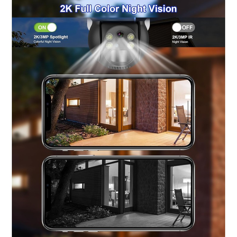 - 【2K Pixel & Full Color Night Vision】 Not only equipped with 2K 3MP high-resolution imaging and wide-angle lens, it also provides full-color night vision function, which can record clear and bright images even in low light conditions. The camera head supports 355° swivel rotation and 90° tilt rotation (Not supports automatic tracking of moving objects).