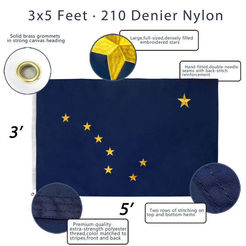 - Specification - Imported. Made of 100% Nylon. Package contains a Anley 3x5 Ft Everstrong series Heavy Duty Alaska State Nylon Flag.