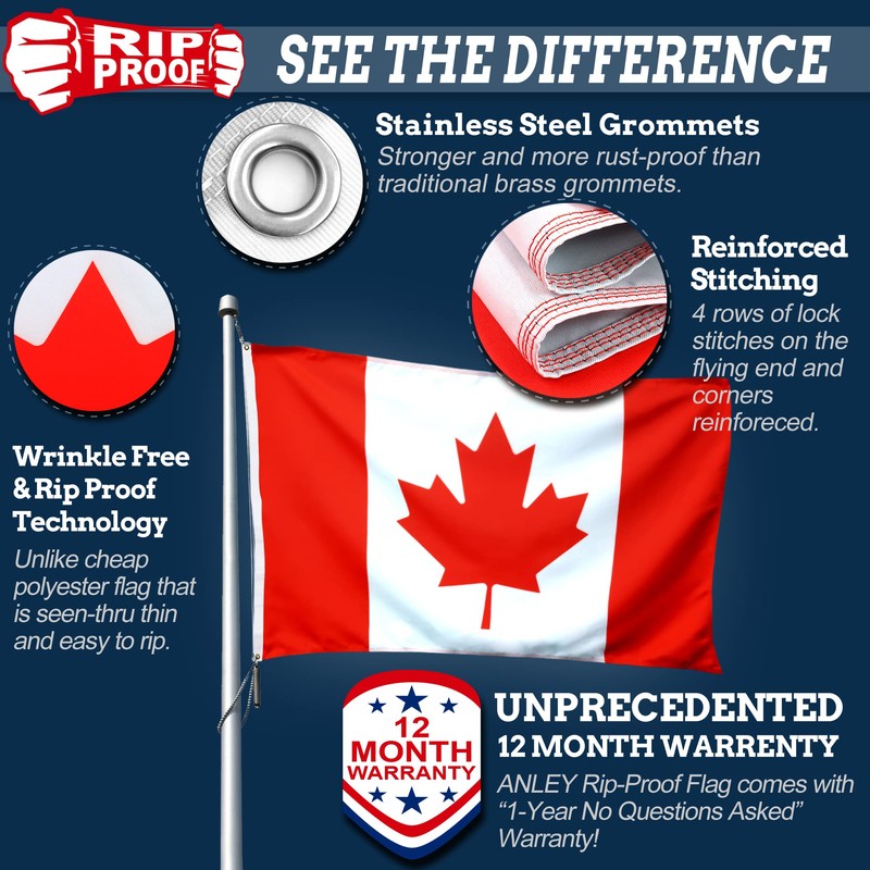 Anley Rip-Proof Technology Double Sided 3-Ply Canada Flag 3x5 Foot - Vivid Color, Canvas Header and Wrinkle Resistant - The Strongest, Longest Lasting Canadian Flags 3 X 5 Ft