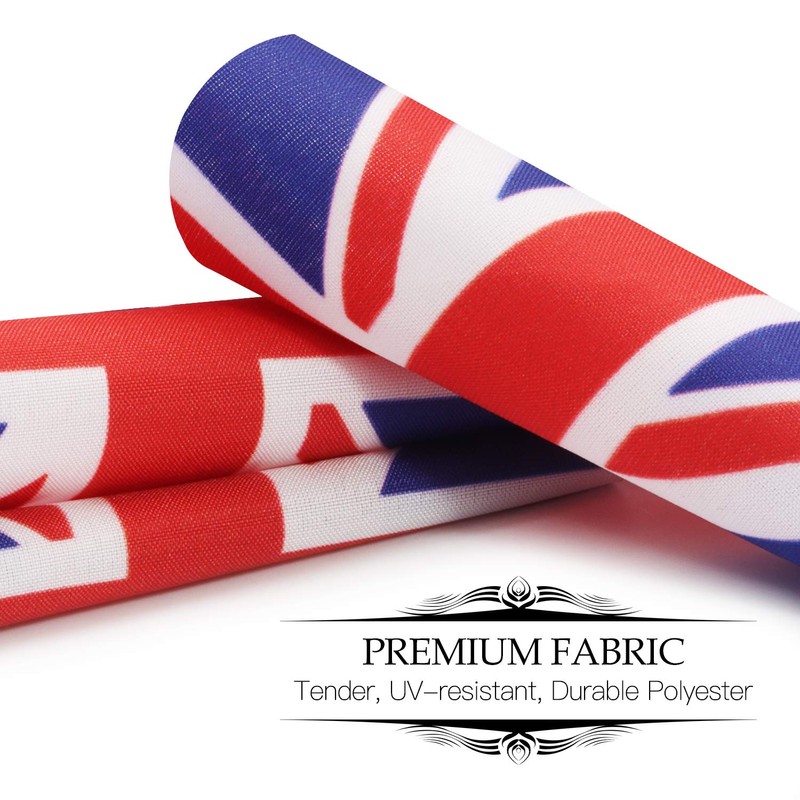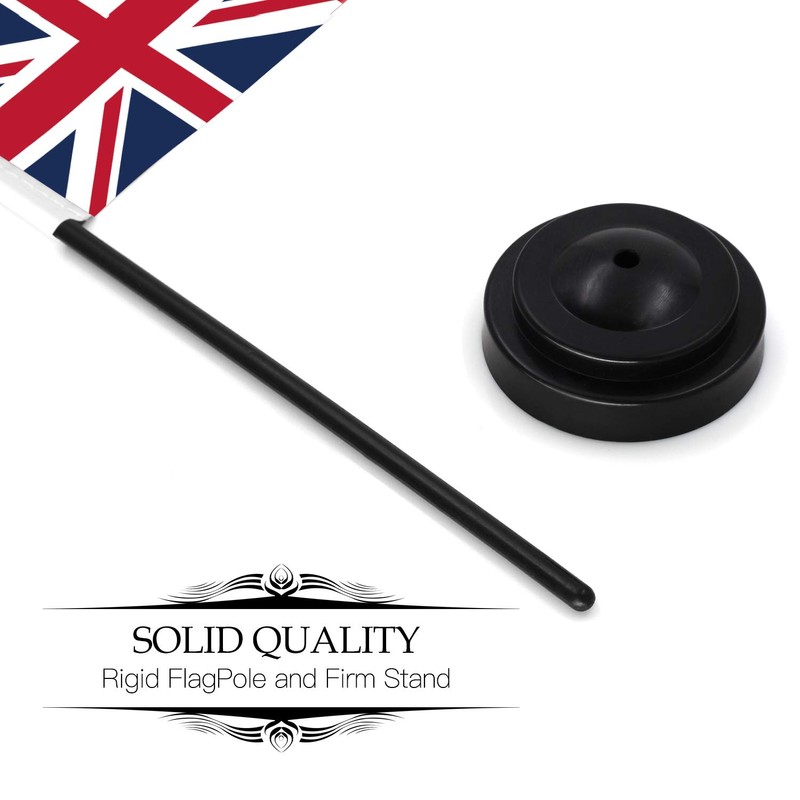 - ✔ CRAFTSMANSHIP - Imported. Made of 100% durable polyester and black solid plastic sticks with a spear top. Comes with a black plastic base to keep the UK flag standing steadily on your desk