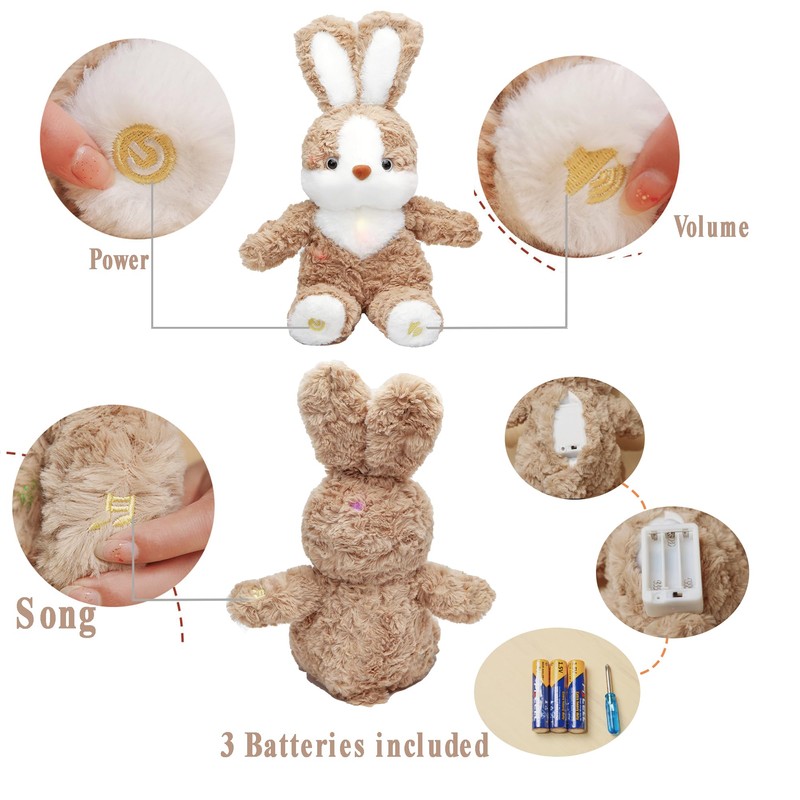 • Interactive Fun: Equipped with LED lights and a music box, this bunny lights up in various colors and plays multiple children's songs. Easily switch songs and control volume with three embroidered buttons.