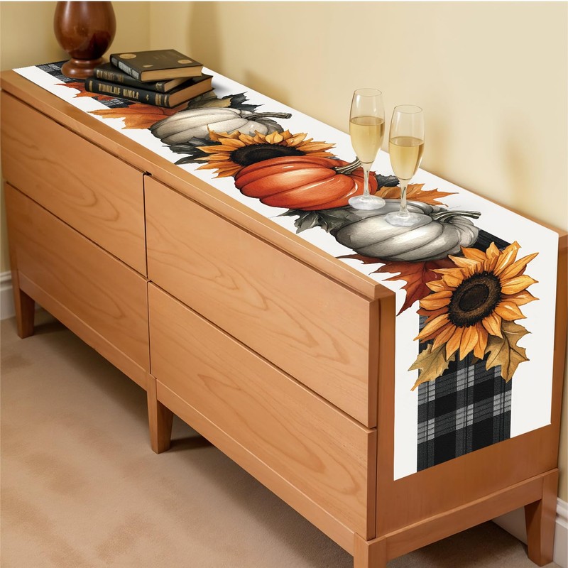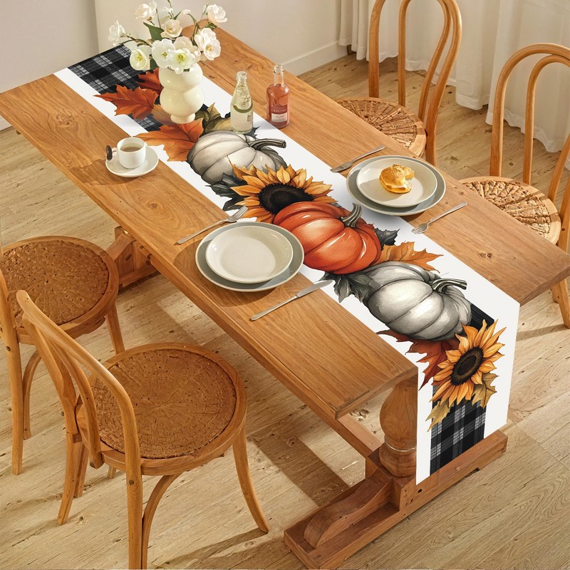 - This fall table runner and placemats set features a buffalo plaid pattern with pumpkins, sunflowers, and autumn leaves, perfect for rustic farmhouse fall decor.