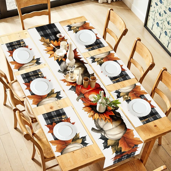 ANNA QUEEN Buffalo Plaid Pumpkin Table Runner and Placemats Set of 6, 13"x72" Table Runner with 12"x18" Placemats, Fall Sunflower Dining Table Set for Kitchen, Farmhouse, Thanksgiving Decor