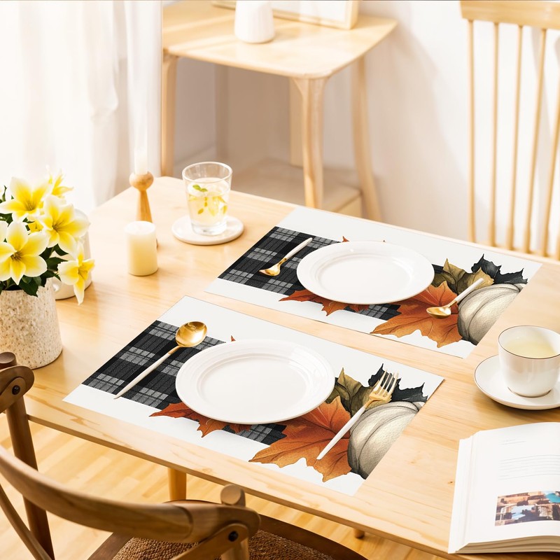 - Includes 1 pumpkin table runner (13"x72") and 6 placemats (12"x18") with coordinating harvest designs, ideal for Thanksgiving or seasonal family gatherings.