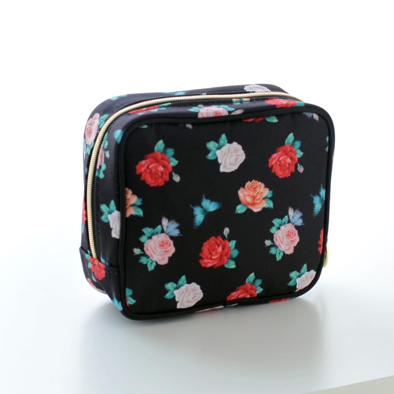 - Product Description: Compact square pouch perfect for storing cosmetics and small items. Anna SUI signature rose print fabric with embossed heart plate. The opening opens wide and stands up on its own, allowing for smooth insertion and removal of contents. There are two pockets on the inside. This pouch is perfect for a wide range of occasions, from everyday use to travel