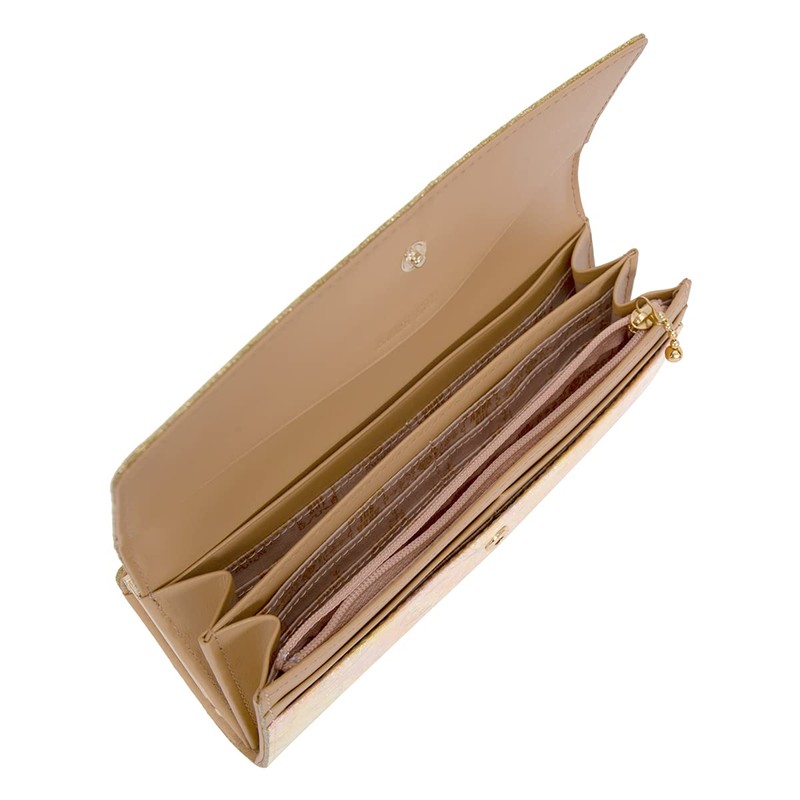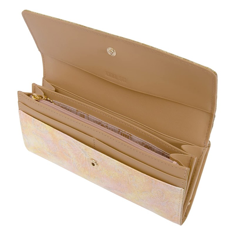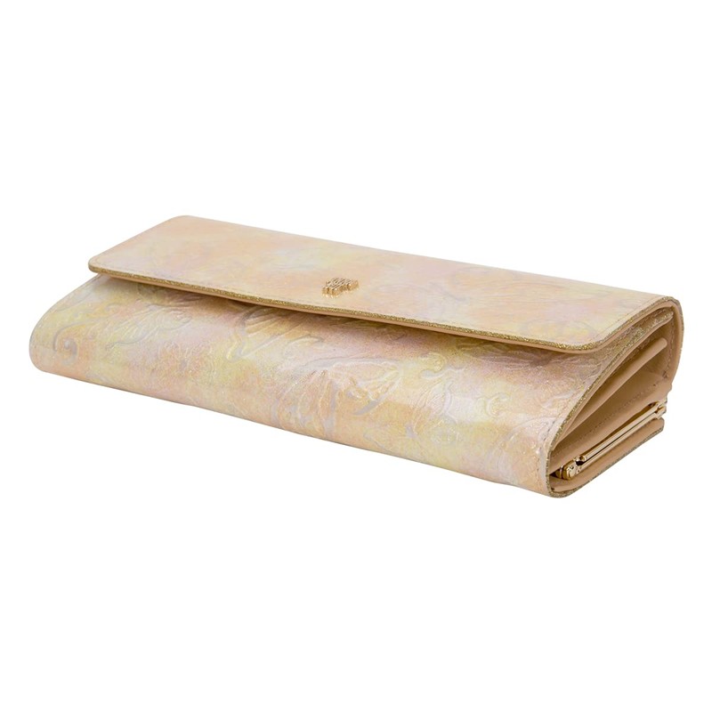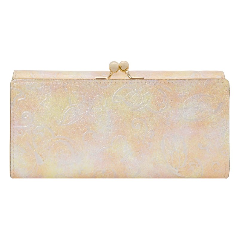 A long wallet with a dangling butterfly motif creates a gentle atmosphere. Enameled cowhide leather This product features a multi-color soft print pattern with embossed details and hand sprayed with fine glitter. It can be opened wide for easy access, and has ample storage and functionality.