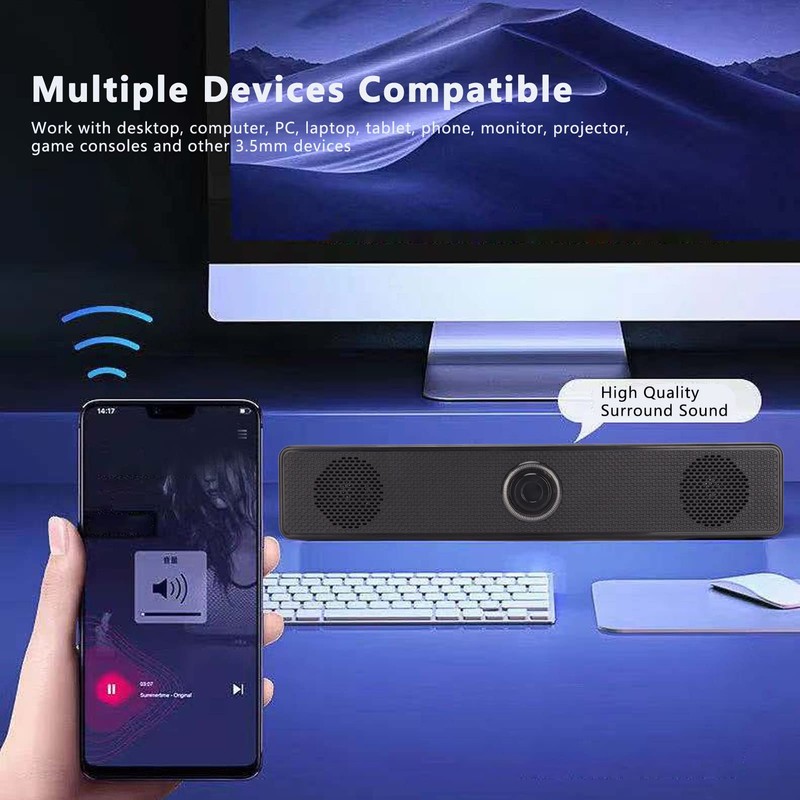 - Free up Desk Space The computer soundbar has a slim design and saves more space under the computer or PC screen. This soundbar with slim design fits well with your computer, fits directly under yours and does not take up space on your desk.
