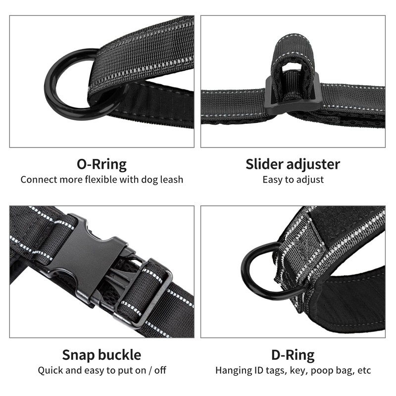 - [Premium No Pull Dog Harness] The wider soft padded inner is comfortable and friendly for dog's neck without dog's fur hurting. The back strap and chest strap inner is made of soft and breathable material that is comfortable for the dogs. And the front strap is better to prevent the dog from rushing forward. This design is maintain a long-time comfortable for walking,jogging,running,training,etc.