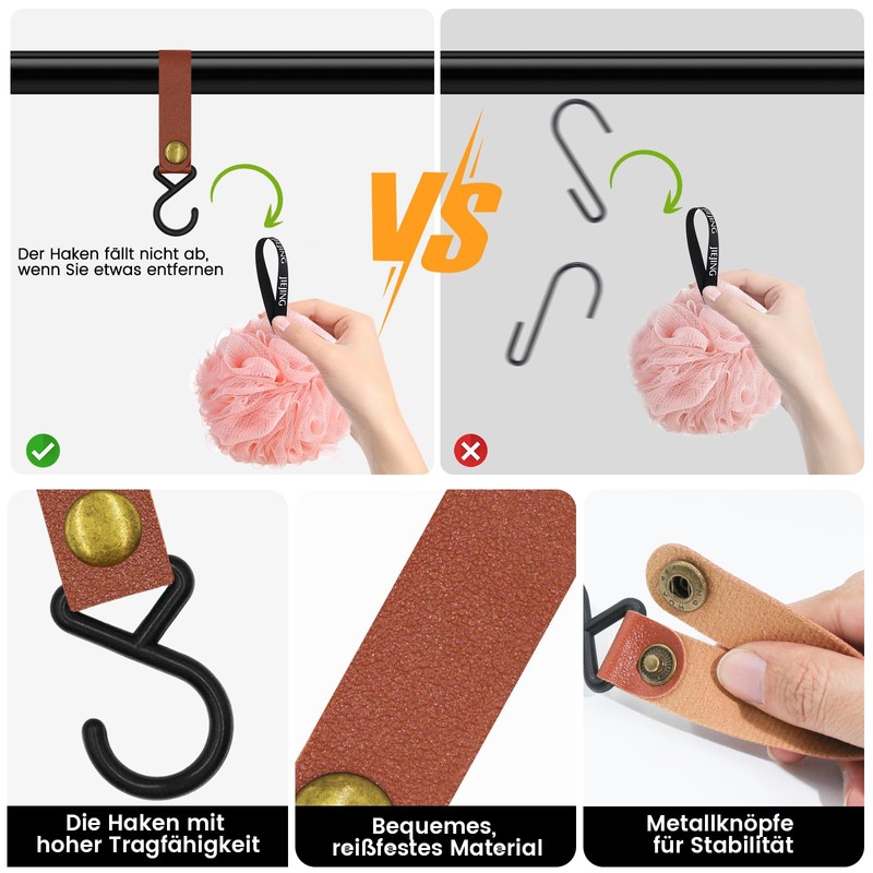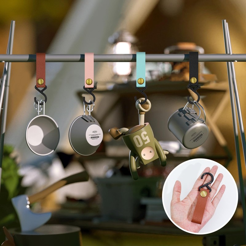- Easy to use: the combination of S hook and leather ring can be easily opened and closed at the touch of a button. Leather rings can also prevent hooks from falling off when items are removed.
