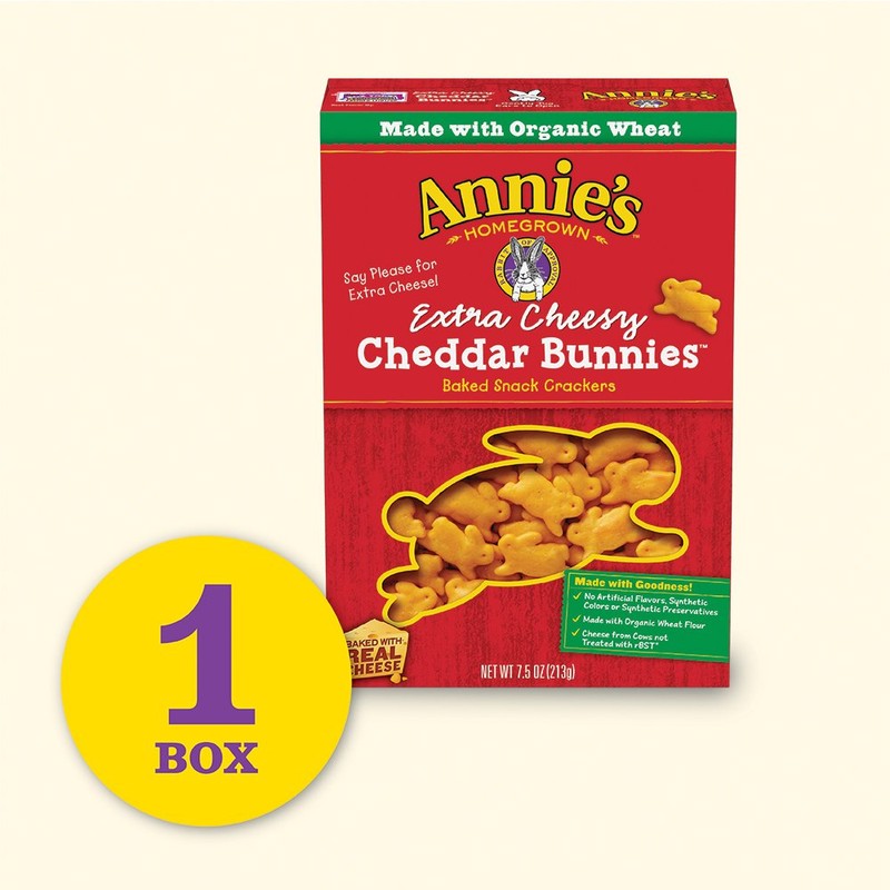 From lunch packing to after school snacking, Annie’s Organic Super Cheesy Cheddar Bunnies are irresistible, real cheese baked bites of yum that every bunny can agree on. That’s right, these bunny-shaped crackers are crispy, craveable, and made with real cheddar cheese goodness – and without the artificial stuff. Plus, these snackable, packable crackers are made with organic ingredients that matter – to you, to farmers, and to the planet we all share.