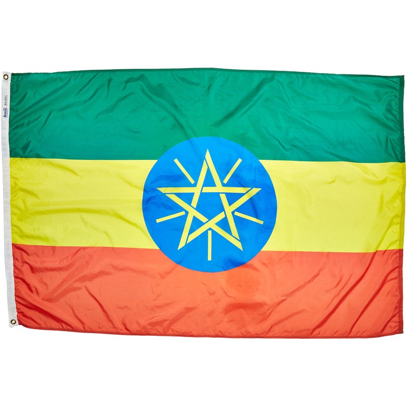 ETHIOPIA – Ethiopia’s flag, adopted in 1996, consists of three horizontal stripes of equal width; green - for land (top), yellow - for peace (middle), and red – for strength (bottom). Resting at its center is an emblem consisting of a gold five point star (representing diversity and unity) with sun rays (symbolizing prosperity) floating on a circular blue (representing peace) background. All Annin Flagmakers flags are sewn in either South Boston, VA or Coshocton, OH. Annin’s superior quality is time-tested and meets the requirements of the most discerning buyer. Nyl-Glo, Tough-Tex and Bulldog are registered trademarks and manufactured exclusively by Annin Flagmakers.