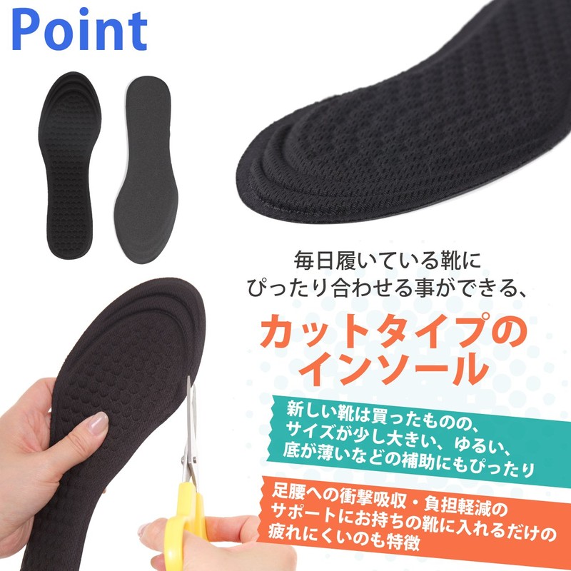 - Cut insoles that can be perfectly matched with everyday shoes. The insole prevents fatigue just by putting it in your shoes to support shock absorption and reduce burden on your waist