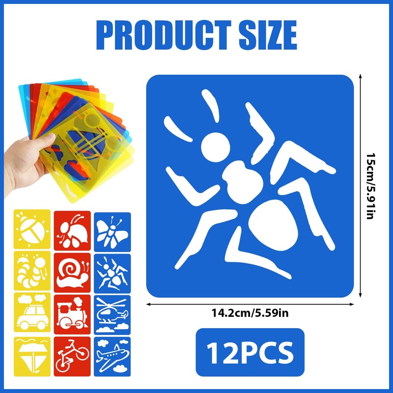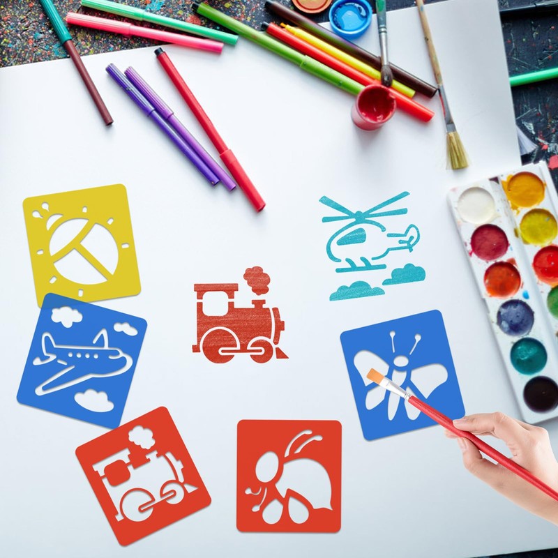 • VARIETY OF DESIGNS CHOICE: This set contains 12 different stencils with lovingly designed designs, including bicycle, train, car, plane, ship as well as various animals such as snail, bee, ladybird and butterfly, which stimulate children's creativity.