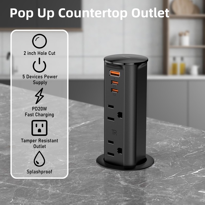 - The pop up outlet is tamper resistant(TR) to meet code and keep children safe from electric shock. Work and cook safe with the splash and dust proof features, easily wipe off water on the socket without damage itself. Perfect addition on your countertop to help you stay organized.