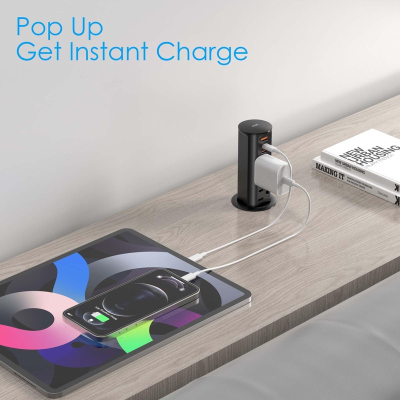 - A gentle press on the top and charge at arm's reach from your desk. No more climbing under desk, weaving power cords through hole for power. The pop up countertop outlet features 2 12 amp rated receptacle for powering appliances and 20W power delivery USB ports for fast and stable charging your phones. Provides multiple options when you need more than one plug at a time.