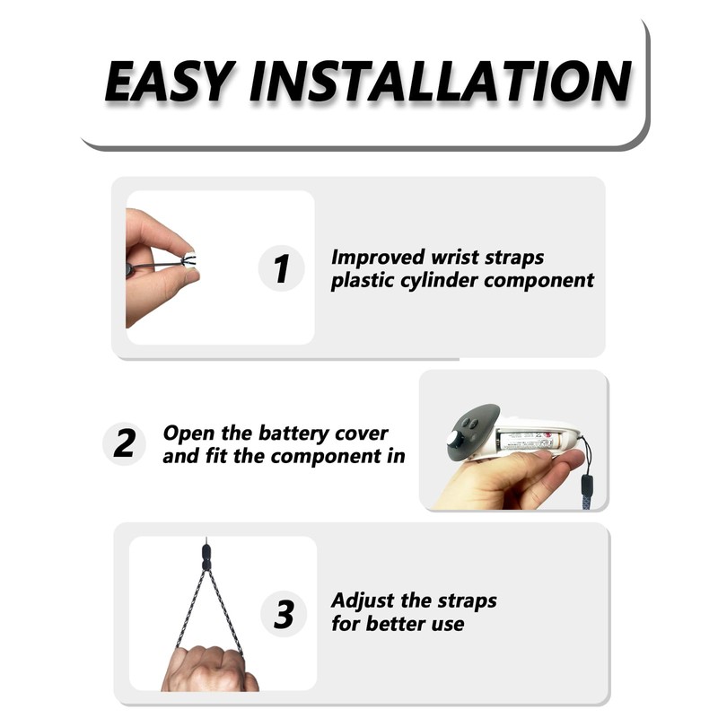 - 🌞Easy to install: Simply push open the battery slot of the grip controller, insert the improved wristband resin cylinder part into the bottom slot, tidy up the cord, close the cover and enjoy your VR game.