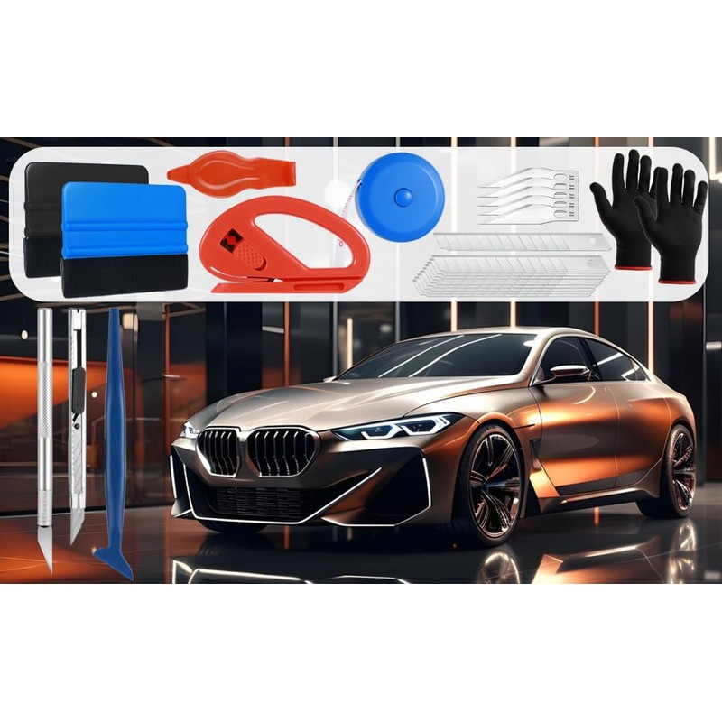 - 🚗【26-Piece Film Application Tool Kit】Our product includes gloves, a tape measure, a micro squeegee, a hook, a film cutting knife, a utility knife with 5 replacement blades, a cutting knife with 10 replacement blades, two felt squeegees, and two replacement felts. It includes everything you need for film application.